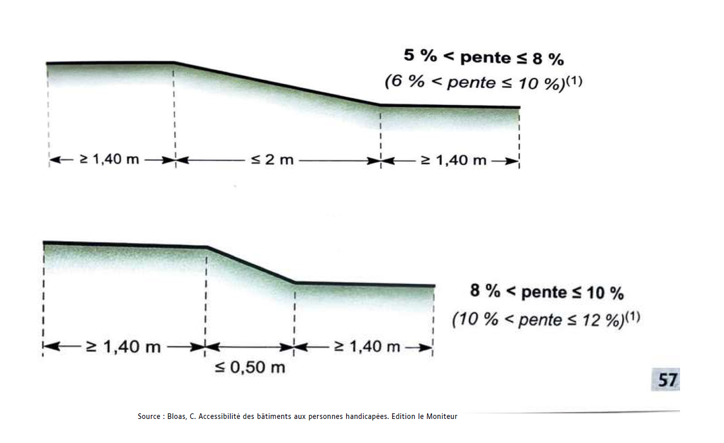 - Si le pourcentage de pente est supérieur ou égal à 5 % sur plus de 10 m, un palier de repos tous les 10 m doit être présent.