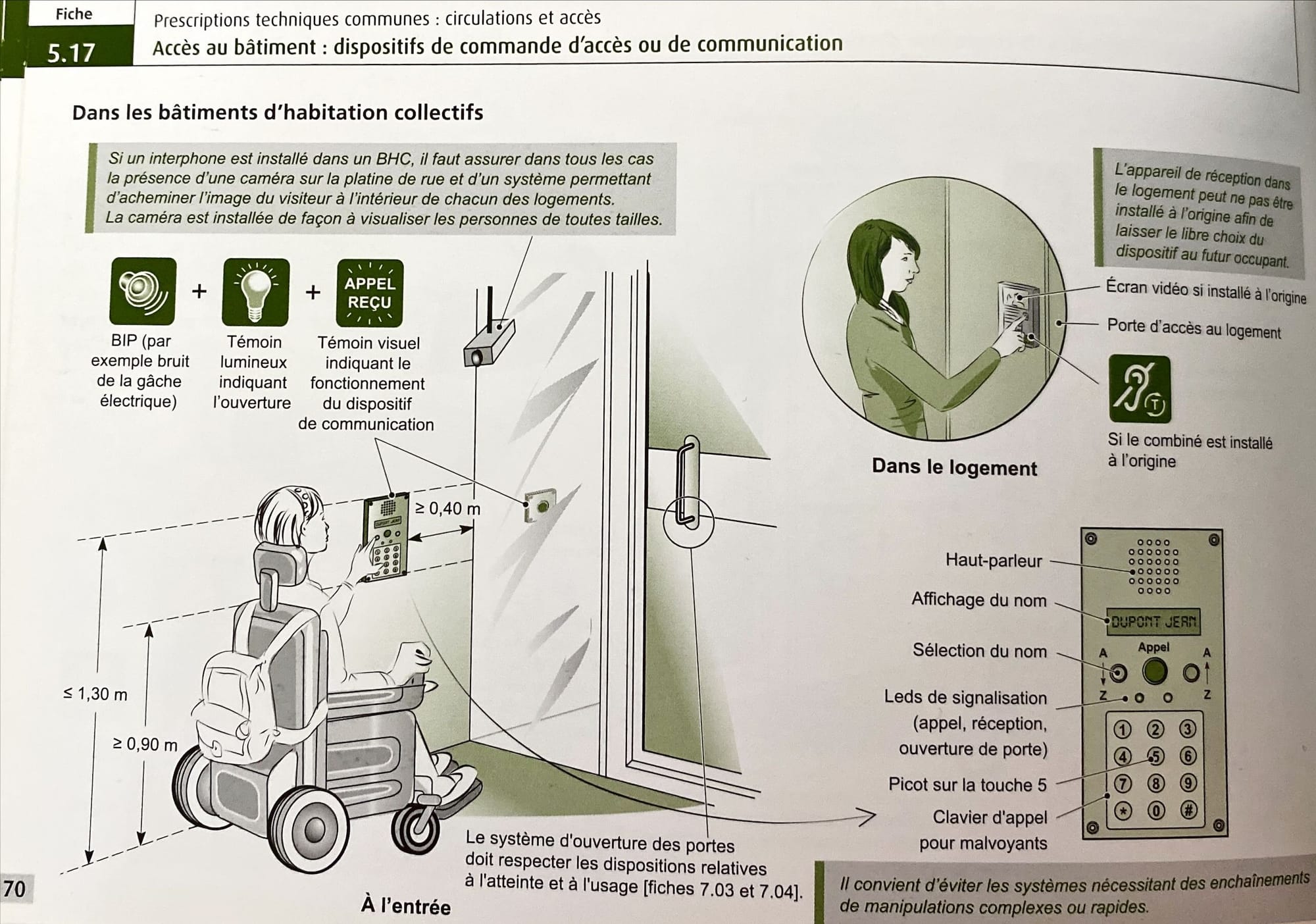 - Libres de tout obstacle : facilement accessibles sans obstruction, un fauteuil roulant doit pouvoir se placer devant le dispositif et pouvoir faire demi-tour si personne ne répond à l'appel.